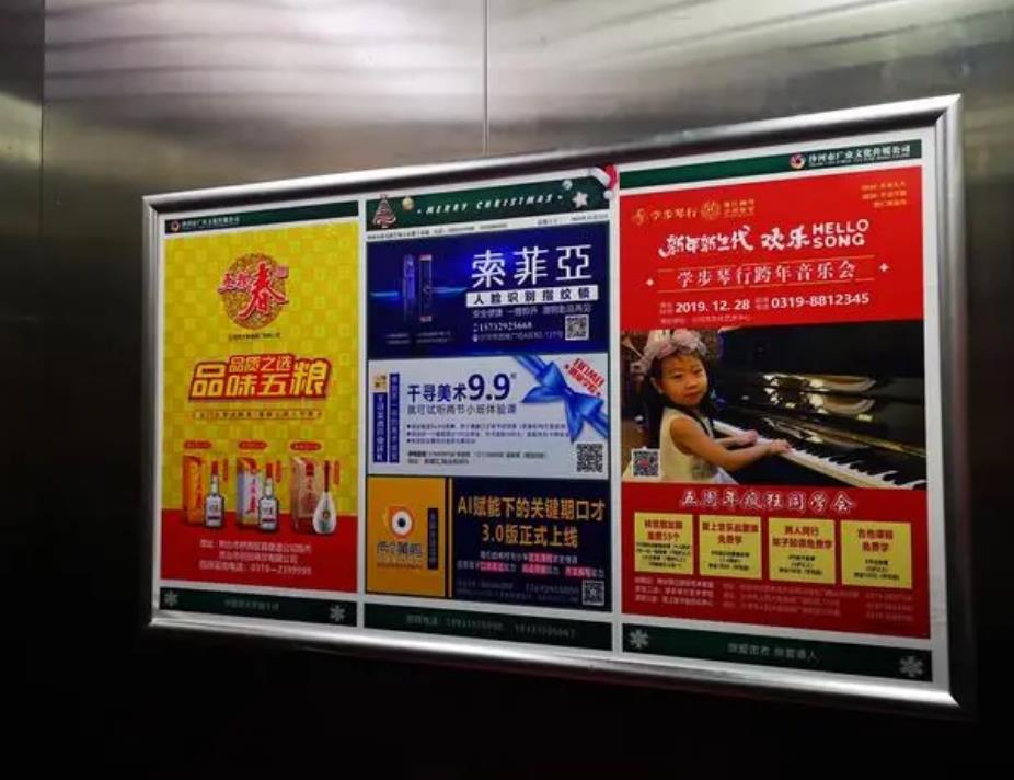 電梯廣告類型多樣,以商務電梯、樓宇電梯為主,表現形式主要為在電梯轎廂內安裝成相框的形式,還有一種是在電梯門上直接安裝廣告。