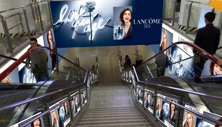 媒體形式:3塊大燈箱(BC10、11、12) + 131平方米墻貼(頂天立地) + 17根包柱(頂天立地) + 2塊梯頂70寸高清液晶屏 + 22平方米梯頂看板+65平方米U型貼+30平方米玻璃貼