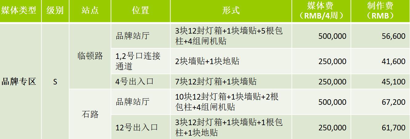| 地鐵12封燈箱加安全門貼 媒體類型 站臺12封燈箱三聯(lián)裝加屏蔽門貼 S:媒體費(RMB/4周/站):220,000元 A++:媒體費(RMB/4周/站):160,000 A+:媒體費(RMB/4周/站):120,000 12封燈箱每塊950元,屏蔽門貼面積根據所選廣告發(fā)布位置的實際面積計算制作費 |
