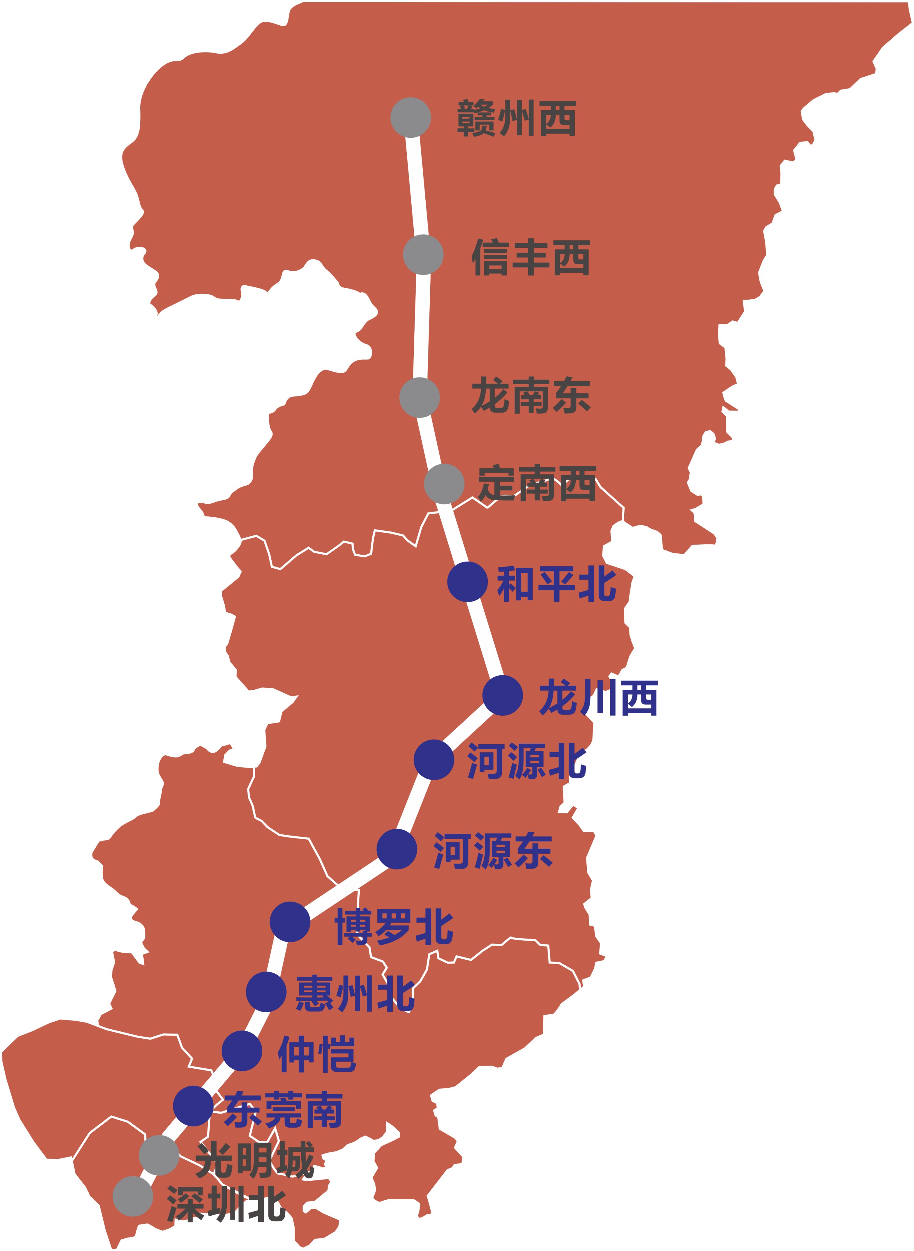 廣東段10個(gè):和平北站、龍川西站、河源北站、河源東站、博羅北站、惠州北站、仲愷站、東莞南站、光明城站、深圳北站。