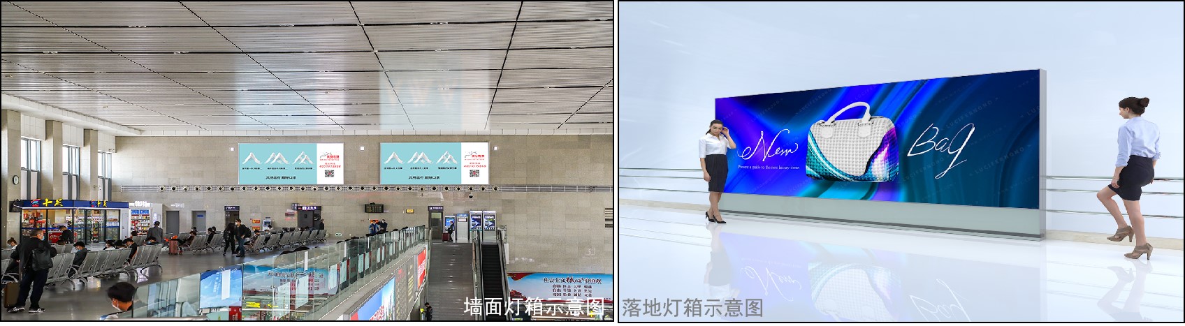 墻面燈箱、落地?zé)粝洹M(jìn)站大廳/候車廳/出站廳