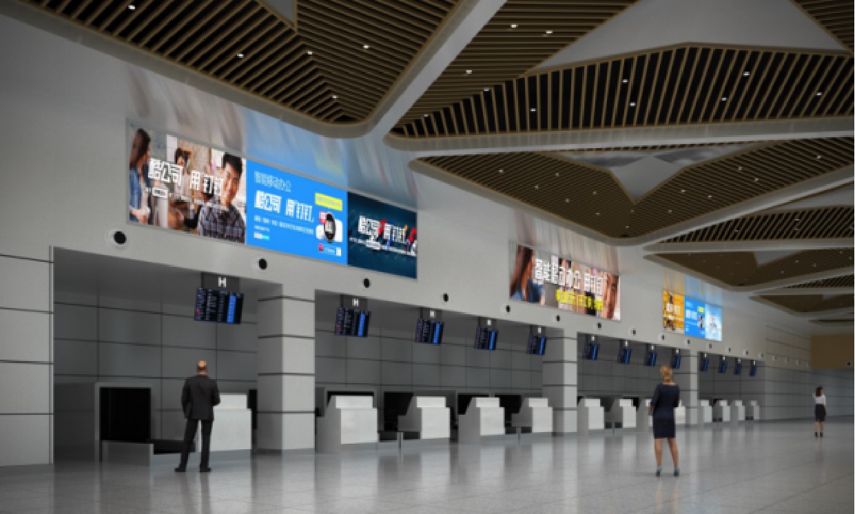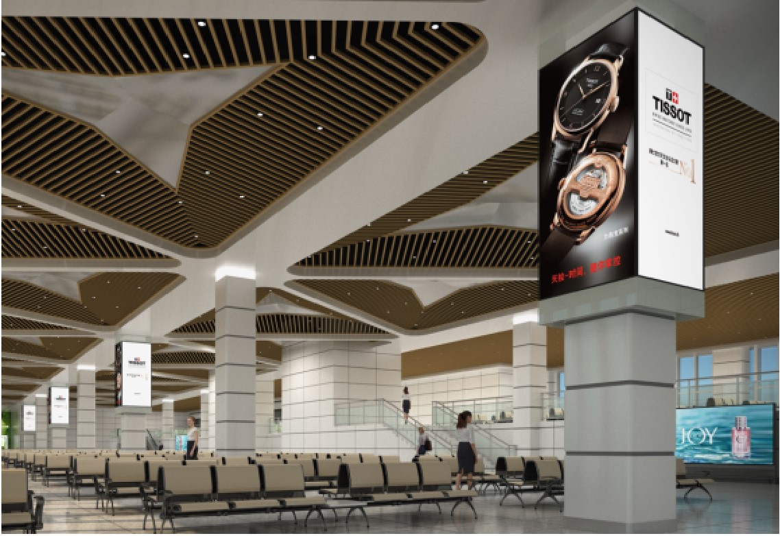 候機廳是旅客必須經過且停留 時間較長的區域,人流密集,媒體連續排列,風格統一,規格整齊。
