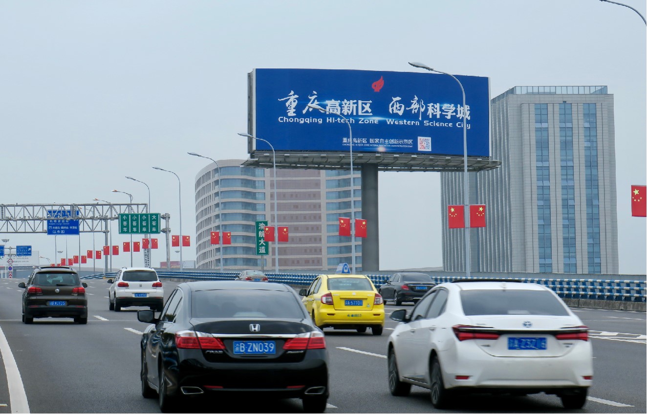 T3航站樓進(jìn)場(chǎng)路第一塊高立柱,地標(biāo)性媒體 ?主城、渝鄰高速、第一機(jī)場(chǎng)大道三條通道匯集。