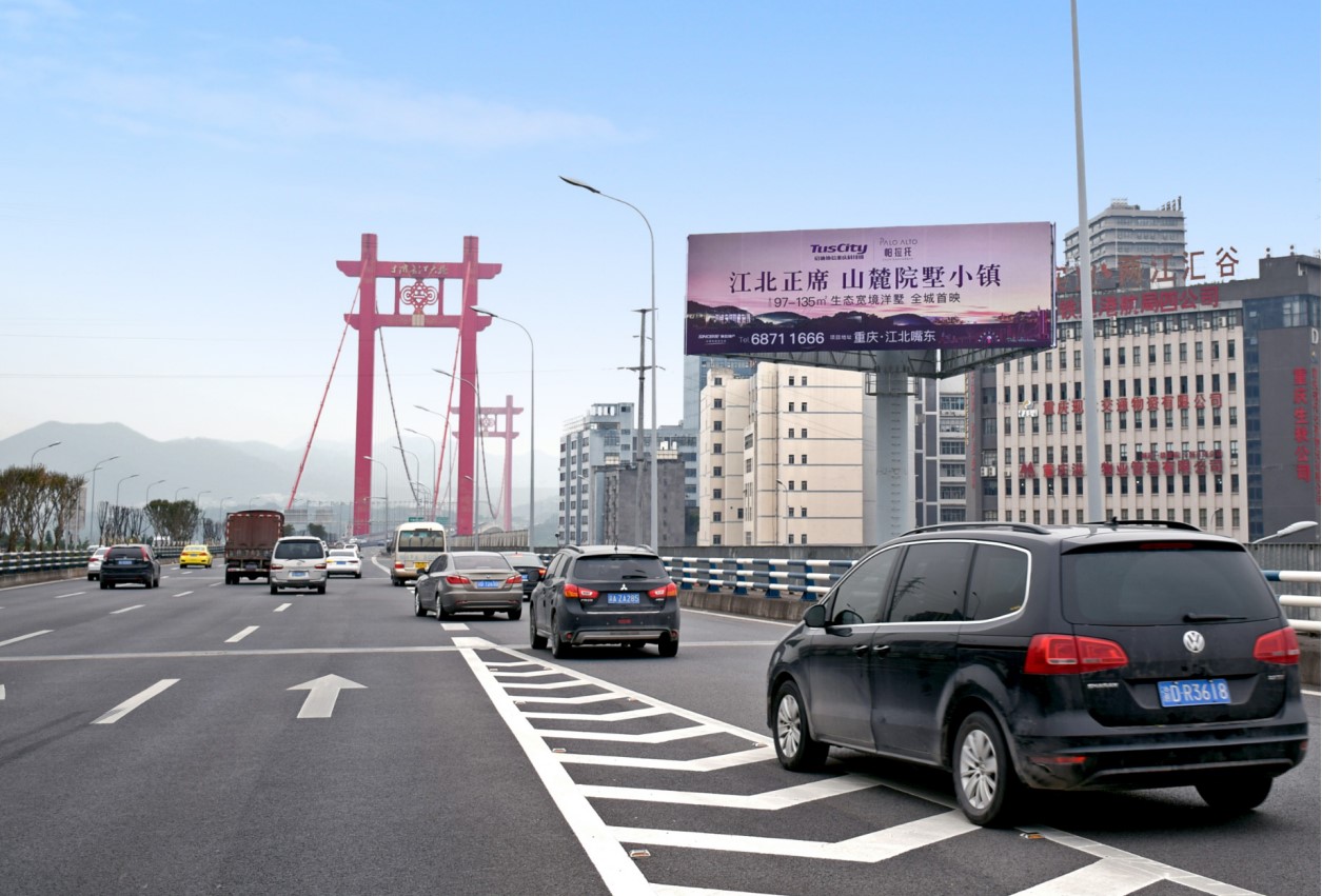 媒體位于立交西上道口同時(shí)能有效輻射立交西出口的所有車輛,距離重慶機(jī)場(chǎng)7公里路程,主要承擔(dān)江北,渝北到T3機(jī)場(chǎng)以及出城東向的車流,進(jìn)出群體多元,車流量大,輻射范圍廣。該區(qū)域無競(jìng)爭(zhēng)媒體,廣告發(fā)布形式單一,視覺沖擊力強(qiáng),有利于廣告信息的傳播,是企業(yè)提高知名度的理想媒體