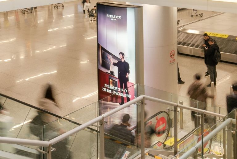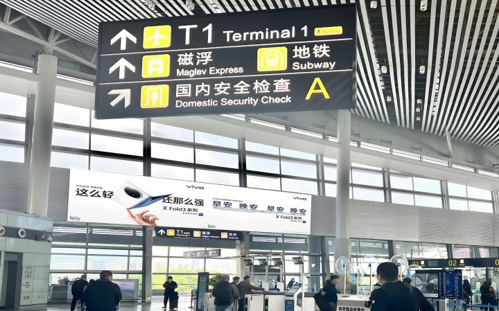 媒體位于 T2 出發層,設置在磁浮地鐵接駁連廊玻璃墻上方,直面國內安檢 A 口客群、 從機場到地鐵磁浮的換乘客群。