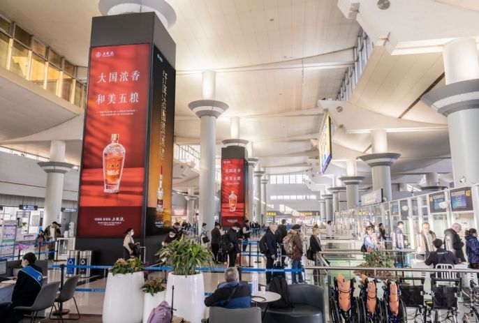 媒體位于 T2 航站樓到達廳外候車區,幾乎覆蓋全 T2 出站客流, 燈箱包柱形象大氣,畫面高挑,視覺震撼感強烈,候車人群媒 體接觸時間長,廣告信息展示充分。