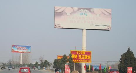 | 媒體形式 : 三面翻廣告牌 有照明 媒體規格 : 30mX6m=180㎡ 兩塊 媒體說明 :該廣告位位于北京大道與信臣路(原312國道)交叉口,可視面積大,可視距離遠,任意方向均可明顯看到廣告牌。車流量:20萬/天;人流量:30萬/天,可視距離遠,視覺沖擊力強,廣告效果絕佳。 |