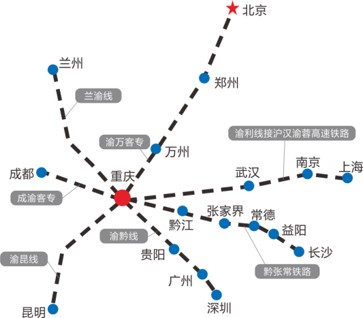國家將重慶定位為國家綜合性鐵路樞紐和國際性綜合交通樞紐。重慶北站鐵路綜合交通樞紐以承擔滬漢渝蓉客車作業為主,實現沿江通道中成渝中線高鐵與渝漢高鐵的貫通運行。隨著渝貴鐵路的正式通車,重慶邁入全國高鐵線路密集城市的腳步變得更快了。