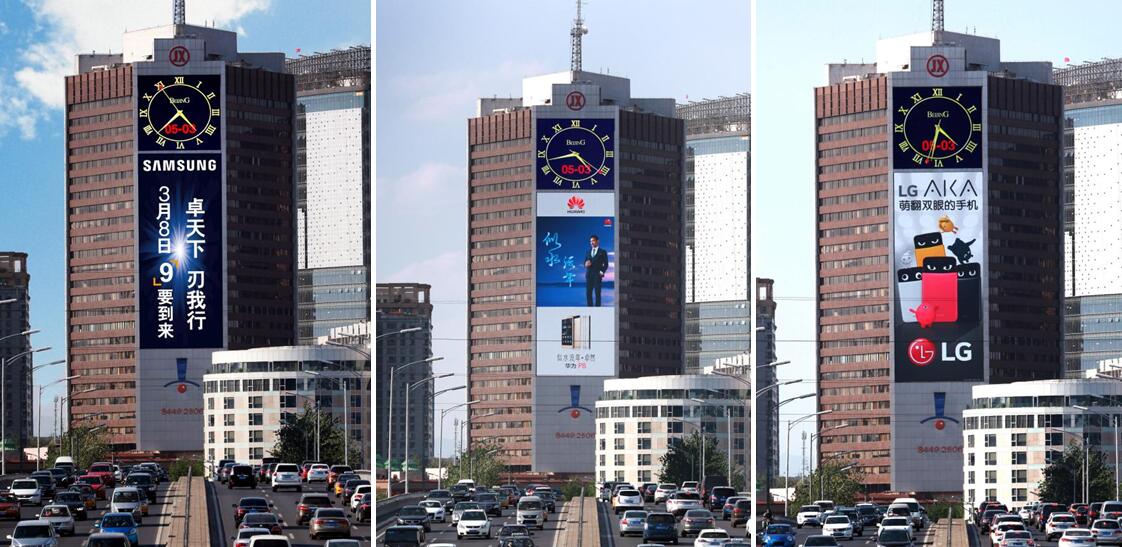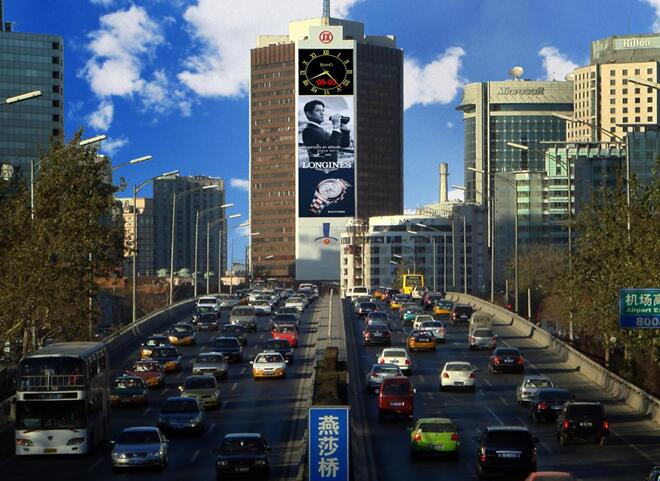 而如果從東三環(huán)去往首都機(jī)場,則更是必定長時間注意到該LED屏。對于來京、出京從事商務(wù)活動的人士來說,巨大的、占據(jù)了整個樓體的該LED屏,極佳的亮度和觀看視野,都注定會長時間留在人們的印象中,成為他們關(guān)于北京的城市記憶中重要的印跡。