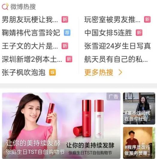 在微博的正文下面,當(dāng)我們閱讀動(dòng)態(tài)或文章時(shí),有時(shí)我們可以看到一個(gè)非常明顯的廣告;在微博搜索框下也有一個(gè)非常明顯的banner廣告位;熱搜欄下方也有類似的廣告位;banner廣告空間。這些板塊在日常使用微博時(shí)很容易注意,其特點(diǎn)非常直接,借助用戶停留時(shí)間,提高信息傳輸?shù)某晒β屎托剩灰脩暨M(jìn)入文本,找到或找到這個(gè)板塊,就很容易找到廣告banner。但總的來說,與其他廣告相比,植入該板塊的廣告更依賴于banner界面和主題的創(chuàng)意是否有吸引力,一般來說,因?yàn)橛脩舾矚g這種創(chuàng)意“硬性”植入廣告形成了一定的“抗體”,經(jīng)常主動(dòng)忽視,所以如何提高這類廣告的有效推廣是廣告主需要考慮的問題。