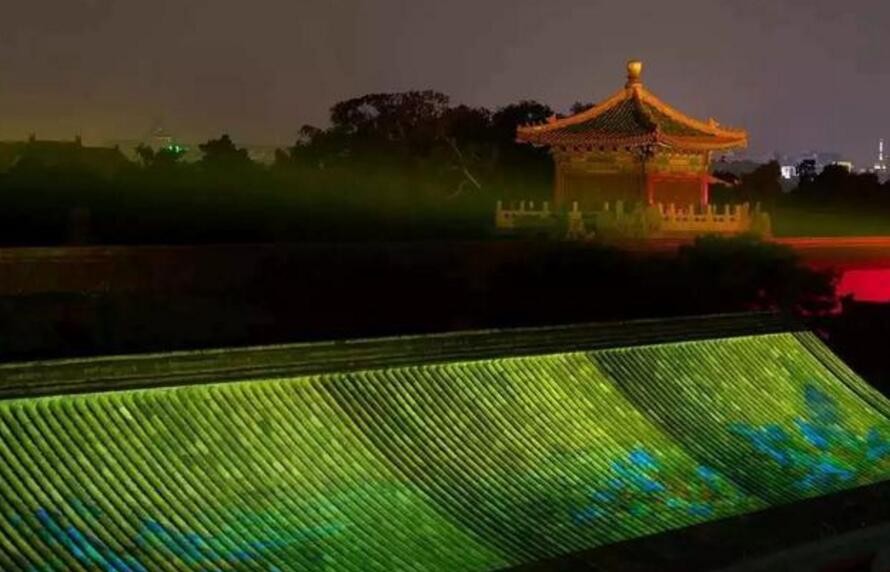 此次夜游故宮最精彩的地方,莫過(guò)于從東北角樓帶神武門(mén)的這一塊區(qū)域了。光與影將《清明上河圖》和《千里江山圖》等畫(huà)卷投影于大殿屋頂上,或如展開(kāi)的折扇,或如綠色的屏障,耳邊還應(yīng)景地回蕩著叫賣(mài)、搖櫓等聲音,古畫(huà)的意境與屋瓦融為一體,靈動(dòng)異常,仿佛人在畫(huà)中游。