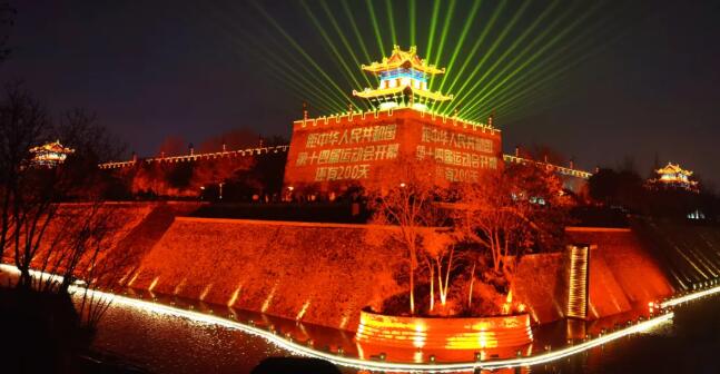 在環城公園美景后面的西安城墻輪廓,被燈光勾勒出來。西南城角更是被璀璨的燈光照亮,“距中華人民共和國第十四屆運動會開幕還有200天”等字樣,顯示在古老的西安城墻上。