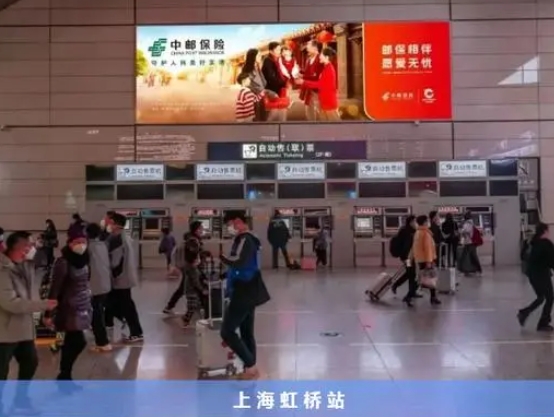 上海虹橋站出發層自助售票區墻面燈箱,位于上海虹橋站候車區北邊商務候車區旁,周圍有售票區和自助取票區,易匯集人群,廣告可見機會大,可見時間長,媒體面積達38.55㎡,視覺效果佳。