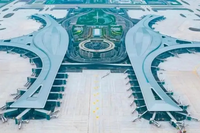 北京大興國際機場,位于中國北京市大興區榆垡鎮、禮賢鎮和河北省廊坊市廣陽區之間,北距天安門46千米、北距北京首都國際機場67千米、南距雄安新區55千米、西距北京南郊機場約640米(圍場距離),為4F級國際機場、世界級航空樞紐、國家發展新動力源 。